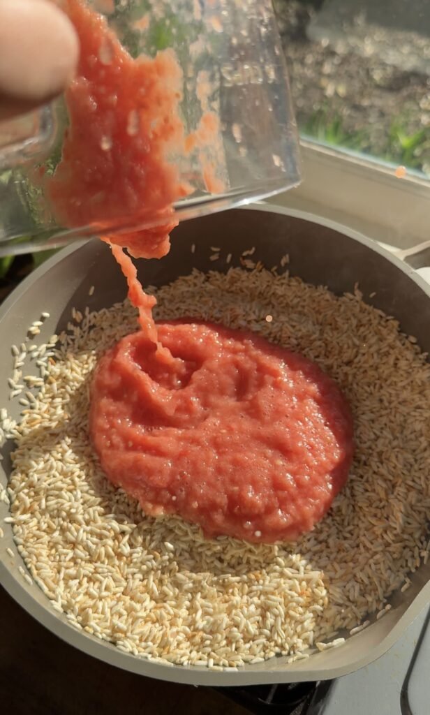 4. Once it is golden brown, add in the tomato puree and the water. Stir it into the rice, bring down to a simmer, and cover to cook for about 15-20 minutes or until all water has been absorbed.