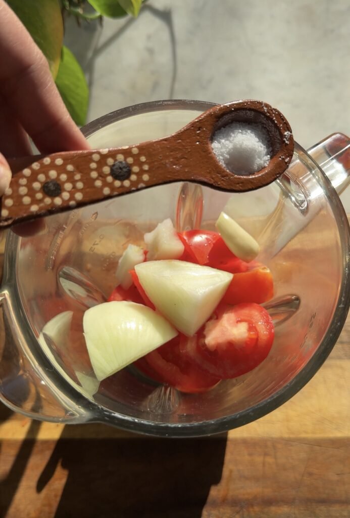 1. Cut tomatoes into quarters, and add to a blender along with onion, garlic, and salt. Blend until smooth.