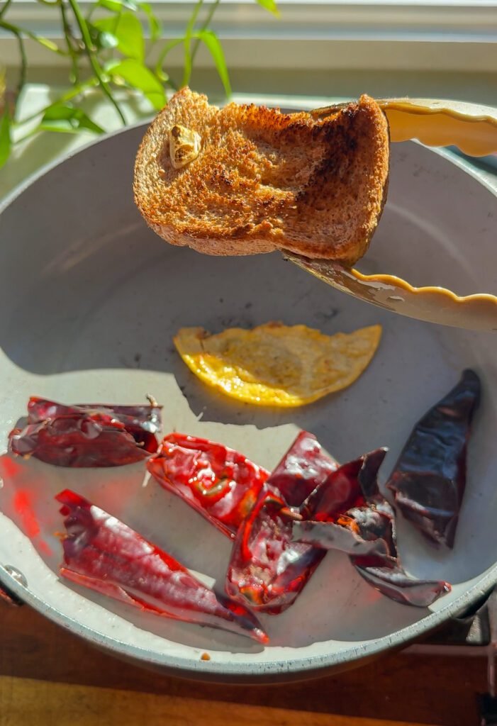 - Add more oil to the skillet and fry the dried guajillo chiles for about 30 seconds on each side. As soon as they puff up and turn slightly red, flip them over and make sure you don’t overcook or burn them. Place them in the bowl with the bread, tortilla, and garlic.