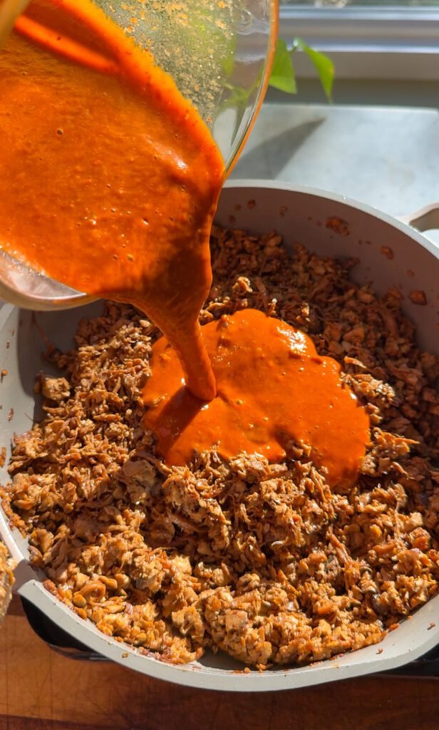 - Strain the sauce and add it to the pan with the shredded king oyster and tofu meat. Heat through.