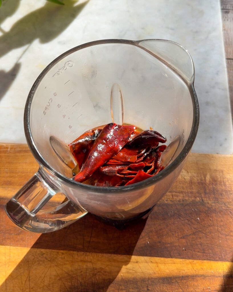 Remove stems and seeds from the dried chiles. Fry all the ingredients, soak, then blend until smooth. Add sauce to your choice of filling/protein.