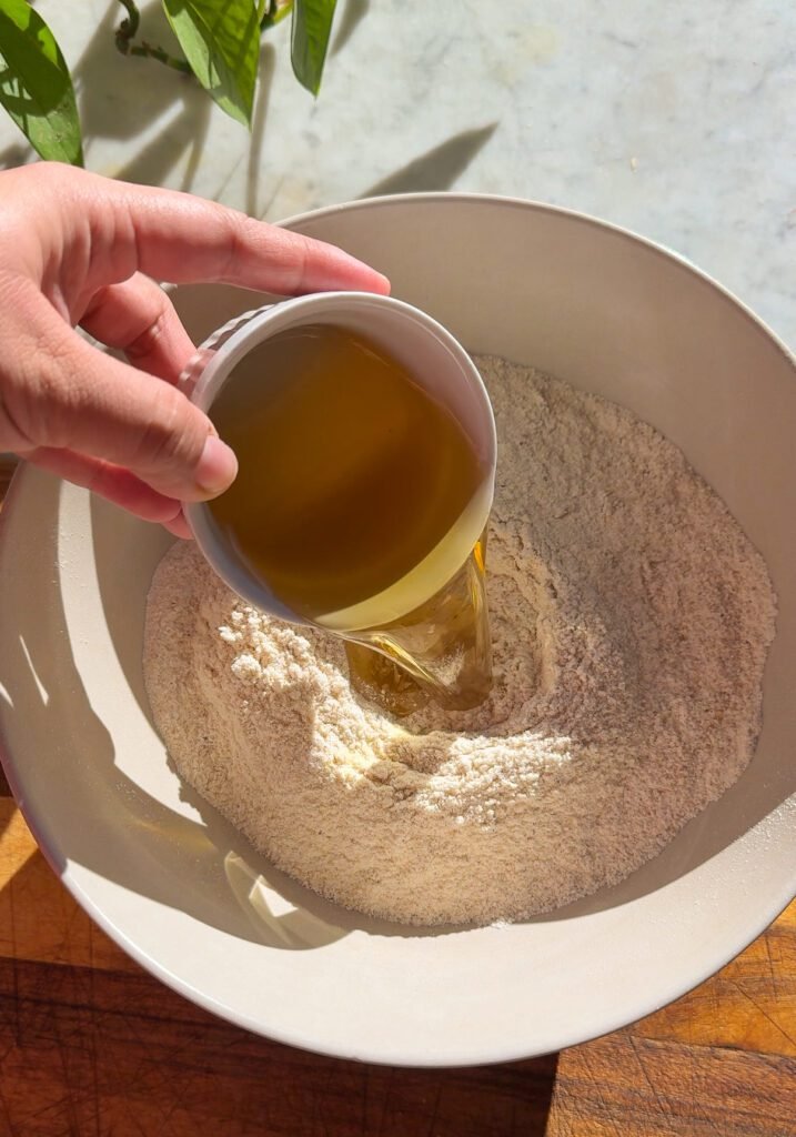 - Start making the dough by adding avocado oil to the Maseca flour. Use your hands to combine the oil with the masa.
